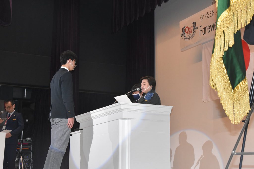 セレモニーの前半は、3年生一人ひとりが成し遂げてきた高校生活の中での成果が表彰されました。成績優秀者や3年間クラブ活動に勤しんだ者、またキャリアトライコースでの武道の授業を通じて、柔・剣道の初段を取得した者など、3年生の皆さんはそれぞれがオンリーワンの努力を積み重ねてきました。