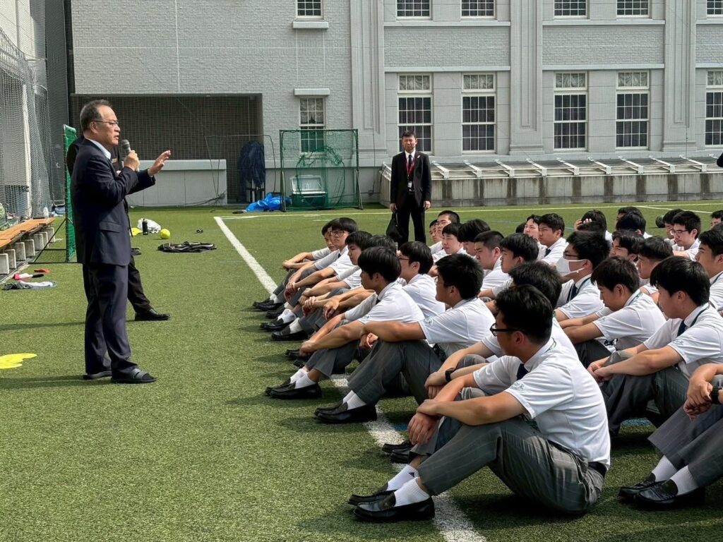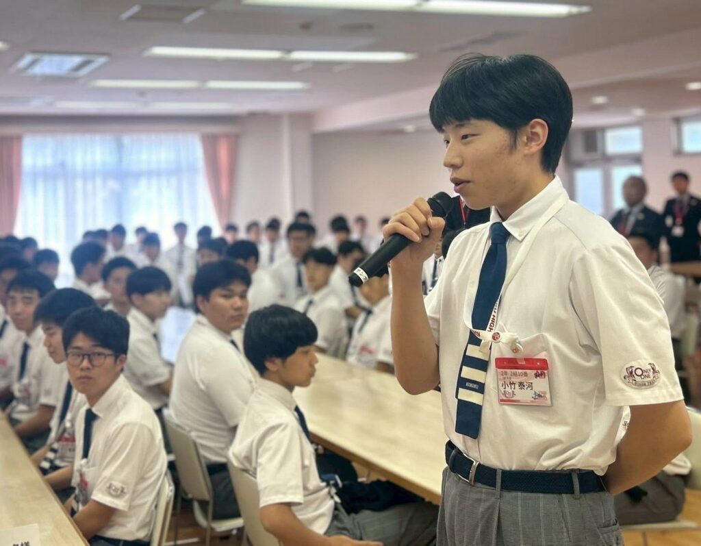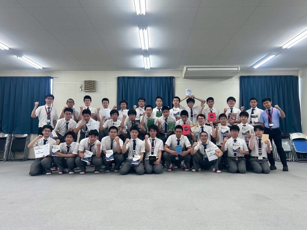 無事に帰阪した後、アリーナにて解散式を行いました。宮野校長補佐より「みなさんは期待以上の成果を上げたと思いますよ。この合宿を糧にして今後も頑張っていきましょう。」とお話があり、続いて団長の梅本教頭より今回の合宿の講評をしていただきました。最後は、生徒代表挨拶として波多野 颯馬君(2年PAD理系/泉佐野市立新池中学校)がこの合宿で学んだことや、今後の目標を述べてくれました!
