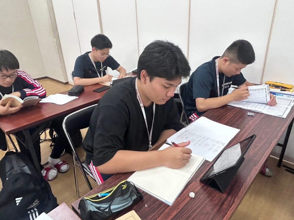 合宿も中日を迎え、体力的にも精神的にも一番ハードな一日かと思いますが、生徒たちは70分×7コマの授業をしっかりと集中して受け、復習や苦手克服など自習にも意欲的に取り組み、成長した姿を見せてくれています。