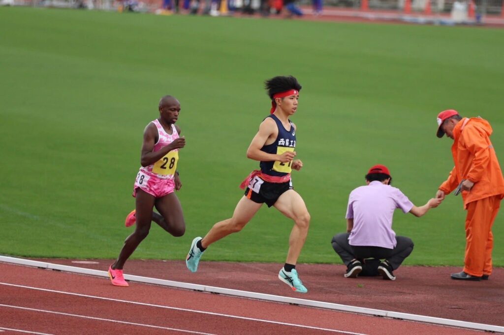 留学生デイビッド ムワンギ(3年AAコース/ケニア)は日本人最速選手と前半から積極的なレースを繰り広げましたが後半に失速し、全国インターハイ出場資格の6位に一歩届かず、7位となりました。