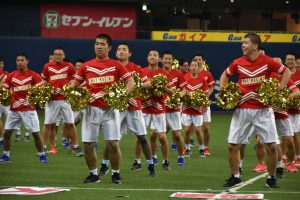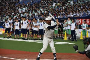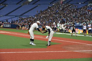 昼食休憩ではエキシビジョンとしてダンス部によるパフォーマンスや応援団チアリーディングが会場を盛り上げ、名物企画となった人文字は、応援歌も歌うチャントにレベルアップ!スピードガンコンテストでは今年から硬式野球部のスーパーバイザーをしていただいている元ジャイアンツの門倉さんが登場!140キロ近い速球に歓声が上がりました!最後は門倉VS喜多の、ジャイアンツVSロッテの夢の対戦も実現!ホームランを狙いましたが、惜しくも打球はフェンス直前で失速。来年こそはホームランを誓った喜多先生でした!