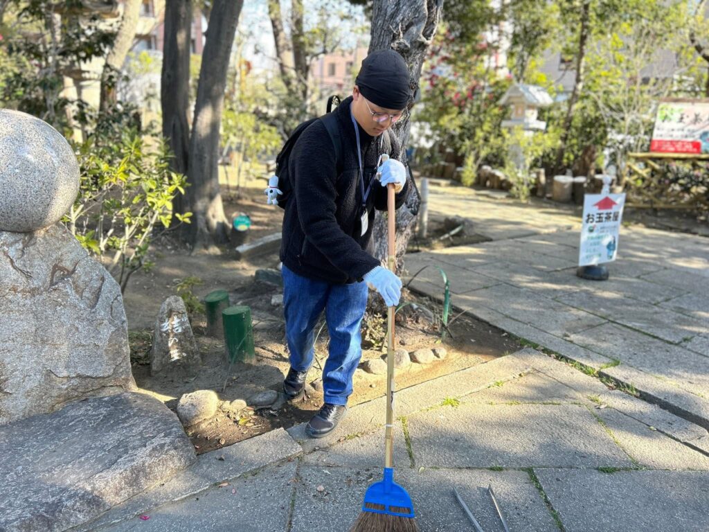 清掃の後には、生國魂神社の権禰宜を務められる中村様より、大阪の深い歴史や人生の大切な在り方についてお話を伺いました。「自分の身体は神様からお預かりしている宝物。だからこそ、自分自身を律して大切に扱わなければならない」という温かなお言葉は、生徒たちの心に優しく響いたようです。地域のために動くことが、巡り巡って自分自身の大きな成長となって返ってくる。その教えを肌で感じた生徒たちの表情には、奉仕活動の意味に触れた喜びが溢れておりました。