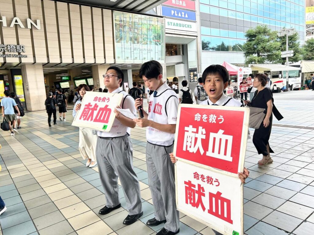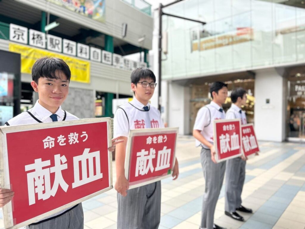 本日、インターアクトクラブの生徒10名が京橋駅前広場で献血普及活動を行いました。