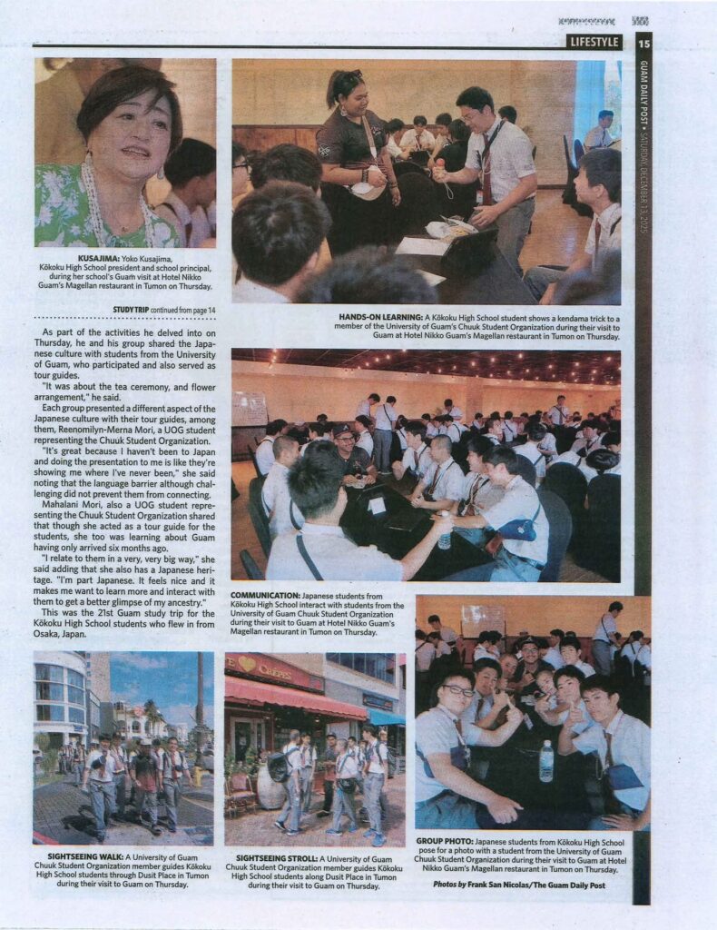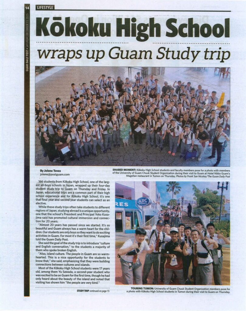 本校アカデミアコース2年生によるグアム海外研修旅行の様子が、現地メディア「THE GUAM DAILY POST」にて紹介され、先日電子版記事のURLをシェアいたしました。 そしてこのたび、同記事の紙媒体を入手いたしましたので、あらためてご紹介いたします。