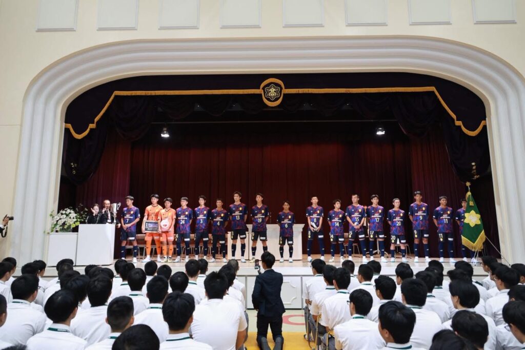 式辞に続き、この夏、スペインで開催された国際ユース大会にて優勝したサッカー部の報告会が行われ、まさに世界へと飛び出し、世界を知り、世界で活躍するということを体現する形となりました。