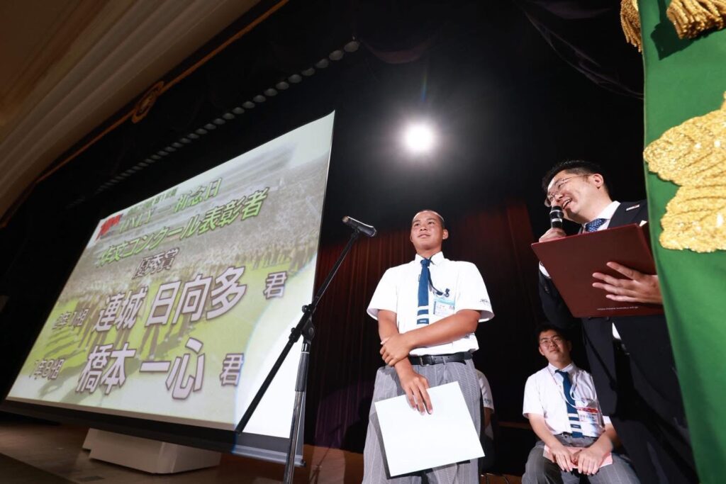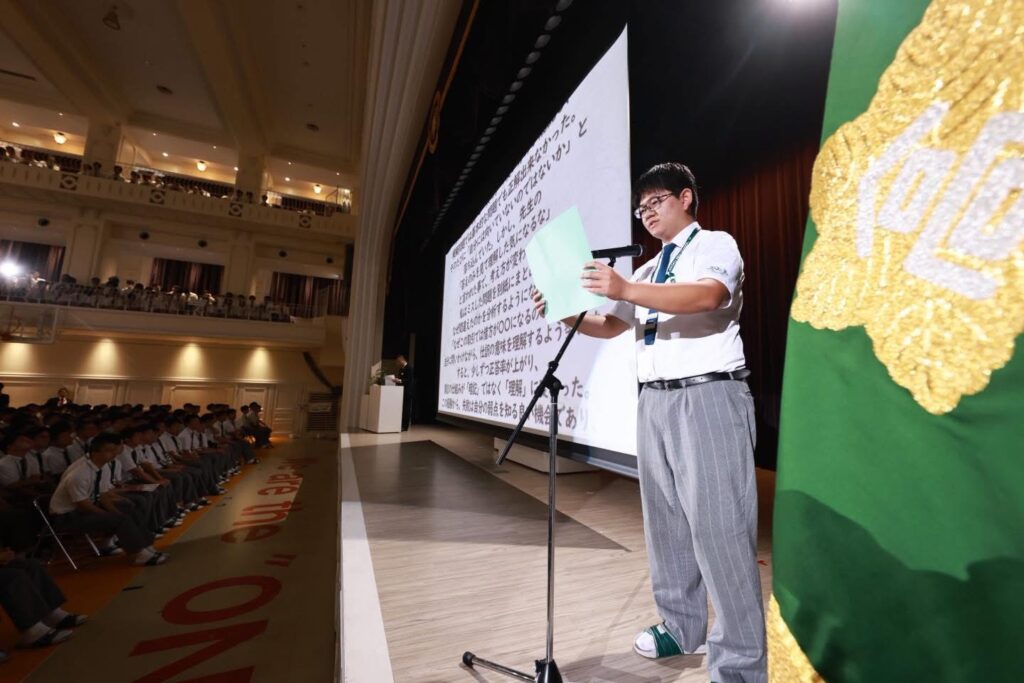 第1部の後半は、作文コンクールで入賞した15名の表彰がなされました。学校長から、一人ひとりに声を掛けながら賞状と副賞が贈呈され、生徒たちがその一言一言に笑顔で応えながら受け取っている様子を見ることができました。そして、最優秀賞に輝いた福地 天斗(3年ITAコース/堺市立平井中学校)、優秀賞に輝いた連城 日向多(2年SAD/和泉市立石尾中学校)と橋本 一心(1年AAコース/大和高田市立片塩中学校/硬式野球部)の3名が受賞作文を朗読してくれました。自分自身としっかり向き合い、自らの想いを込めた言葉たちが全校生徒や教職員の胸に届き、その想いに共感し、感動を覚えるほどの立派な朗読でありました。