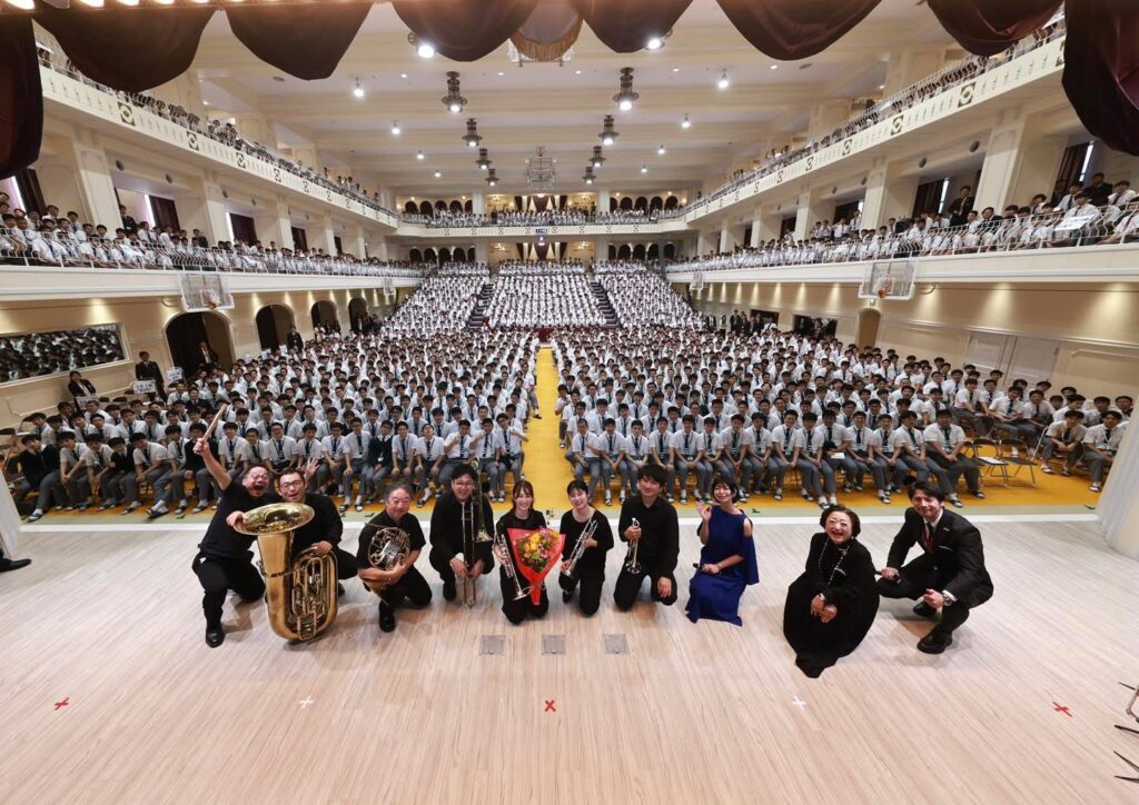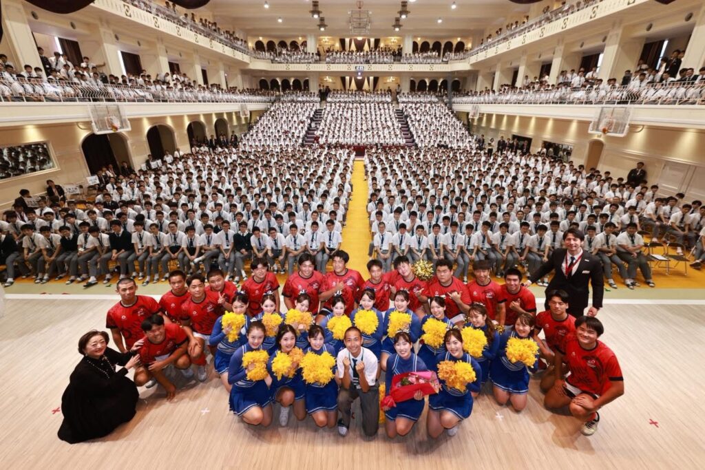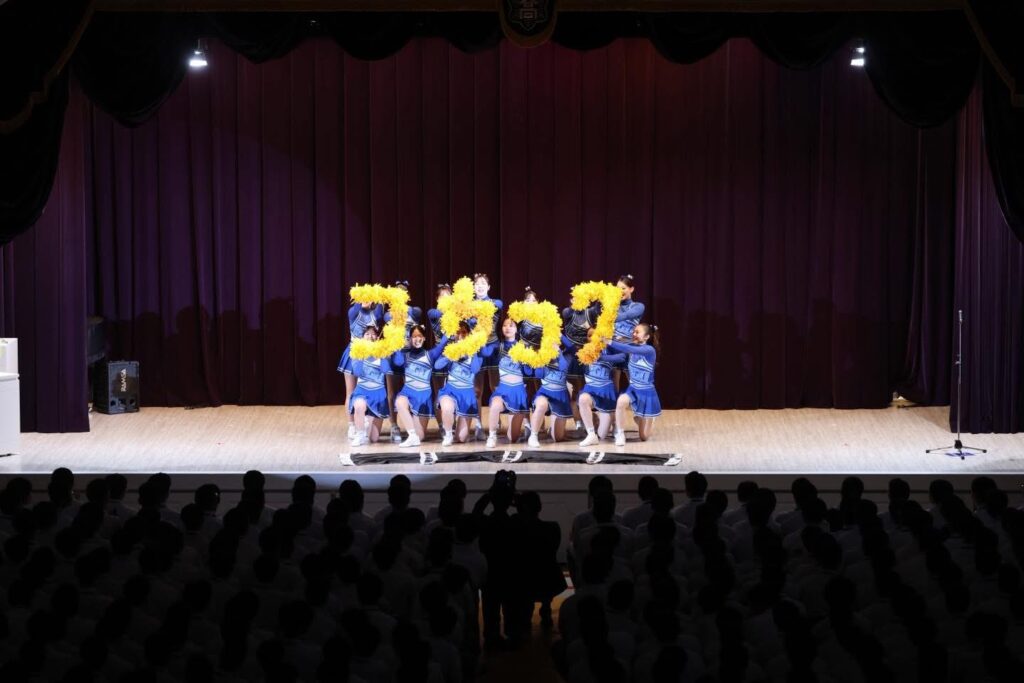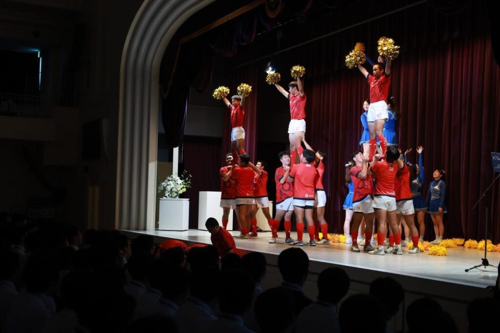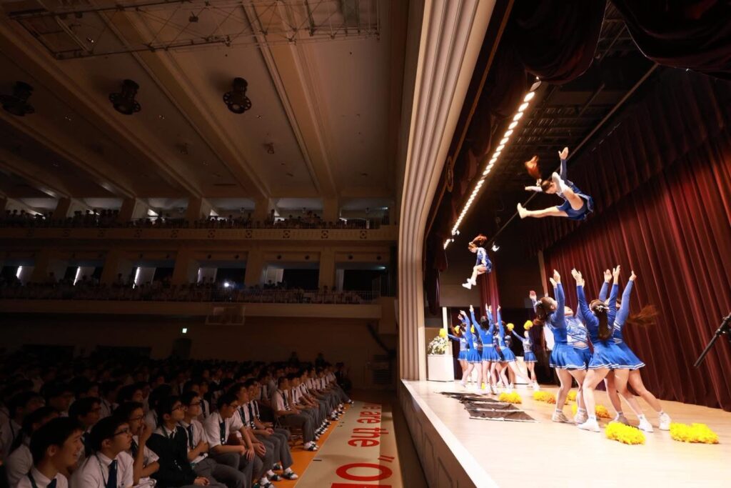 2組目は、関西学院大学チアリーダー部DOLPHINSの皆様による圧巻のパフォーマンスが披露されました。これから大学入試や就職試験に立ち向かう3年生、海外研修旅行が控えている2年生、進級前に自らの進路を真剣に考え始める1年生、そして国民スポーツ大会をはじめ秋に公式戦を控えている各クラブに向けてエールを届けていただきました。パフォーマンスのエンディングでは、本校ラグビー部の精鋭たちで構成されたKOKOKUチアボーイズが登場し、DOLPHINSの皆様から事前にレクチャーを受けていた「2段リフト」を披露し、DOLPHINSとのコラボパフォーマンスに会場中のボルテージが最高潮に達しました。