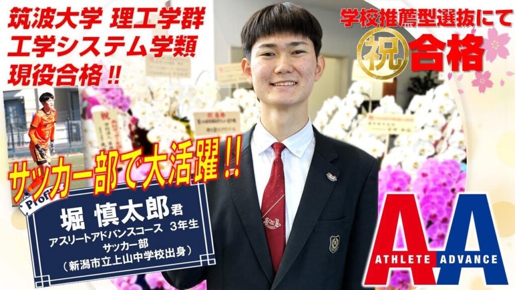 本校3年生の堀 慎太郎(AAコース/サッカー部/新潟市立上山中学校)が、学校推薦型選抜にて筑波大学 理工学群 工学システム学類に現役合格いたしました!