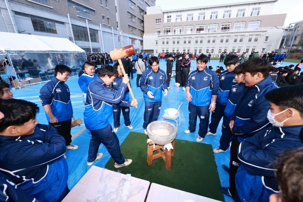 アリーナでの集会を終えると、日頃より大変お世話になっている氏神様の久保神社を参拝いたしました。その後、グラウンドにて伝統となっている、お餅つきを行いました!今年の目標を胸に抱きながら、生徒一人ひとりがお餅をつき、つきたての美味しいお餅をいただきました!自分たちでついたお餅は格別で、全員笑顔で頬張っておりました!
