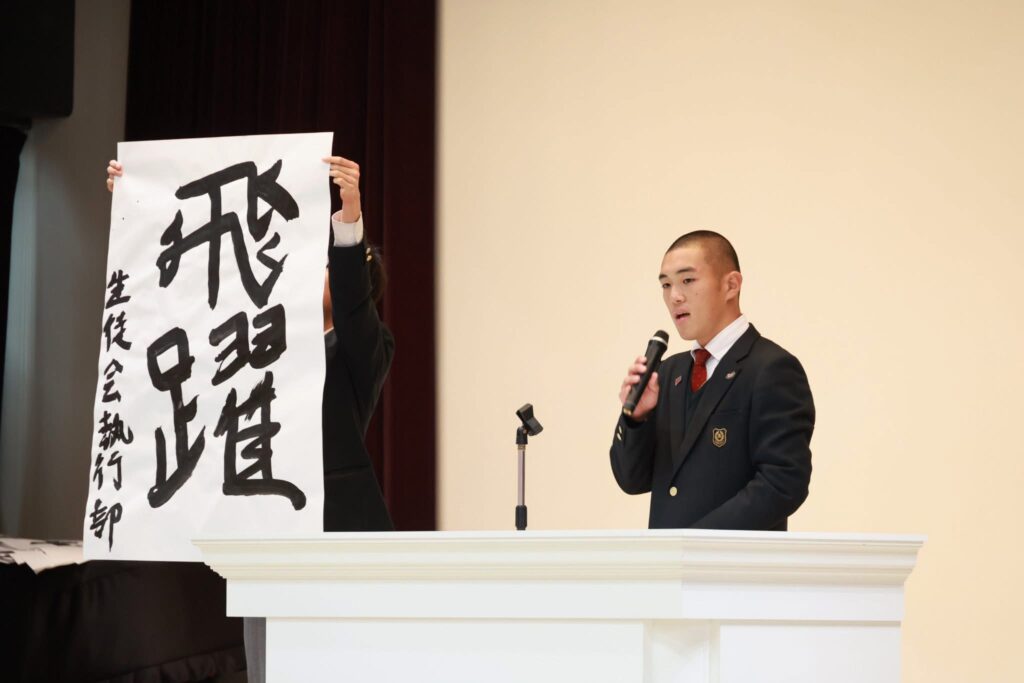 令和8年 第18回 年初始動式を執り行いました。アリーナに会したクラブ生に対して学校長より年頭の挨拶があり、年末年始に掛けて活躍した陸上競技部とサッカー部を労いながら「諦めない心が、最後の最後に奇跡を起こすということを改めて実感しました。この学園のモットーは『諦めないこと』。興國高校名にこそ負えやと校歌にあるように、2年生・1年生のみなさん、興國の名を背負ってやり切ってください。次に輝くのは、あなた方です。」と力強いエールが送られました。その後、運動部20クラブ•文化部18クラブの各主将・部長が舞台に登壇し、順に今年の決意を表明いたしました。