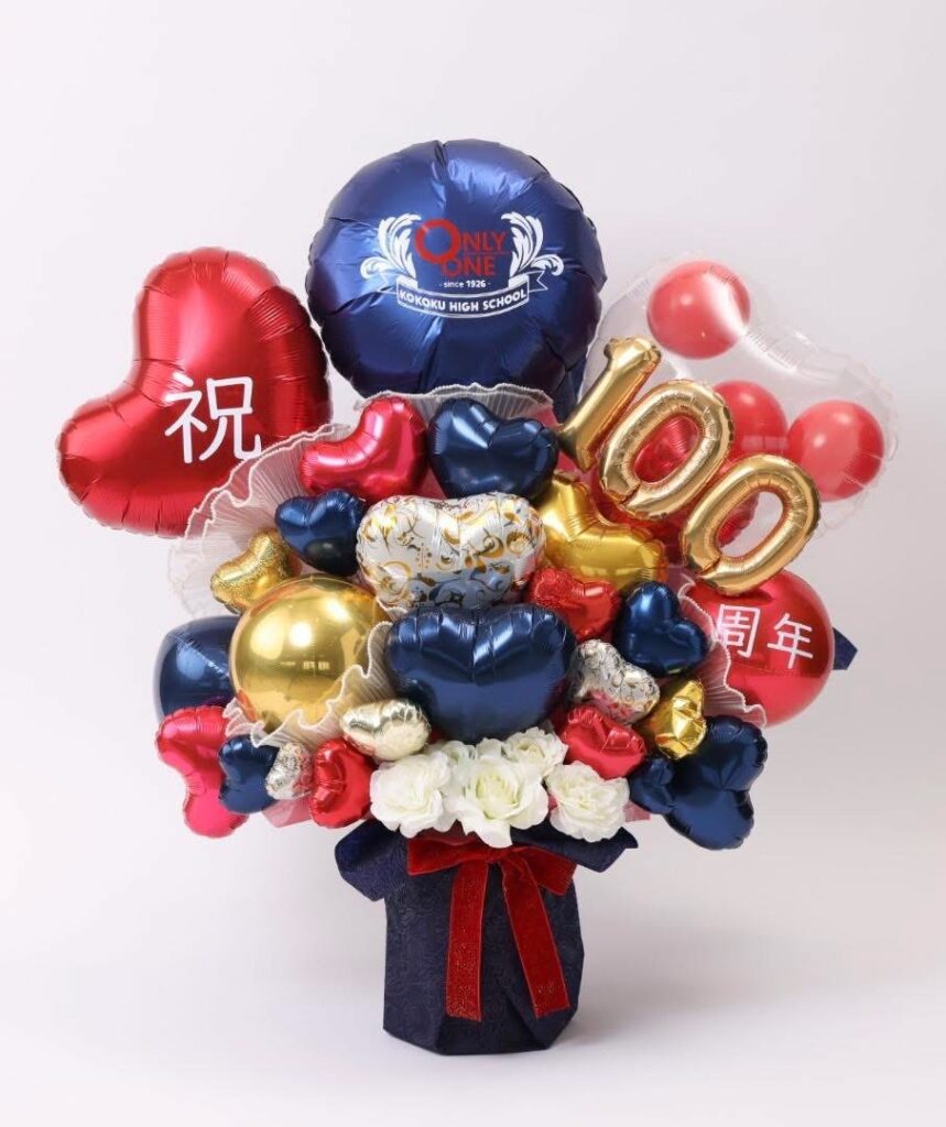 興國学園創立100周年のお祝いとして、バルーンアーティストの須原 三加様より、バルーンアートのお花をお贈りいただきました。学校のカラーである青と赤を基調とし、「100」の数字があしらわれた、100周年のお祝いにふさわしい華やかさと存在感のある作品です。
