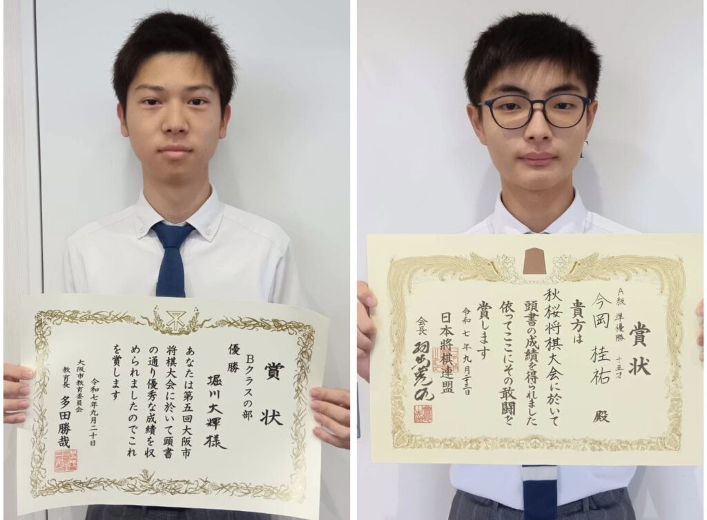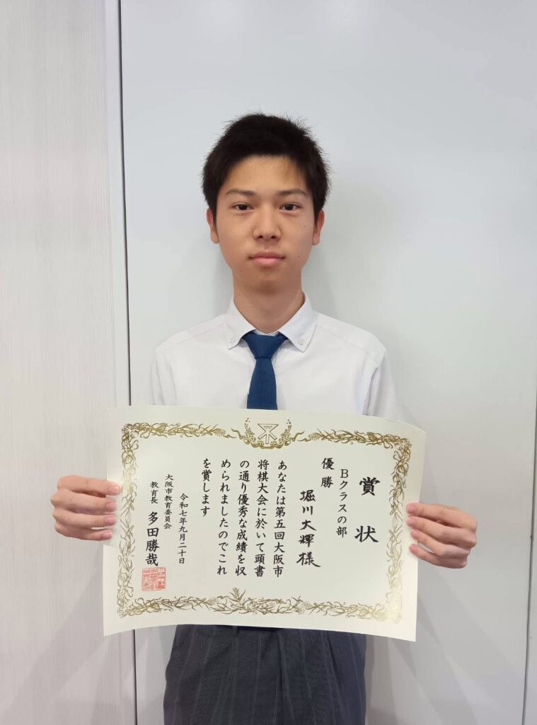 9月20日、大阪市北区民センターにて行われた第5回大阪市将棋大会に本校の囲碁将棋部より、堀川 大輝君(3年SAD/大阪教育大学附属平野中学校)が参加し、Bクラス(初段~4級)で優勝することができました!