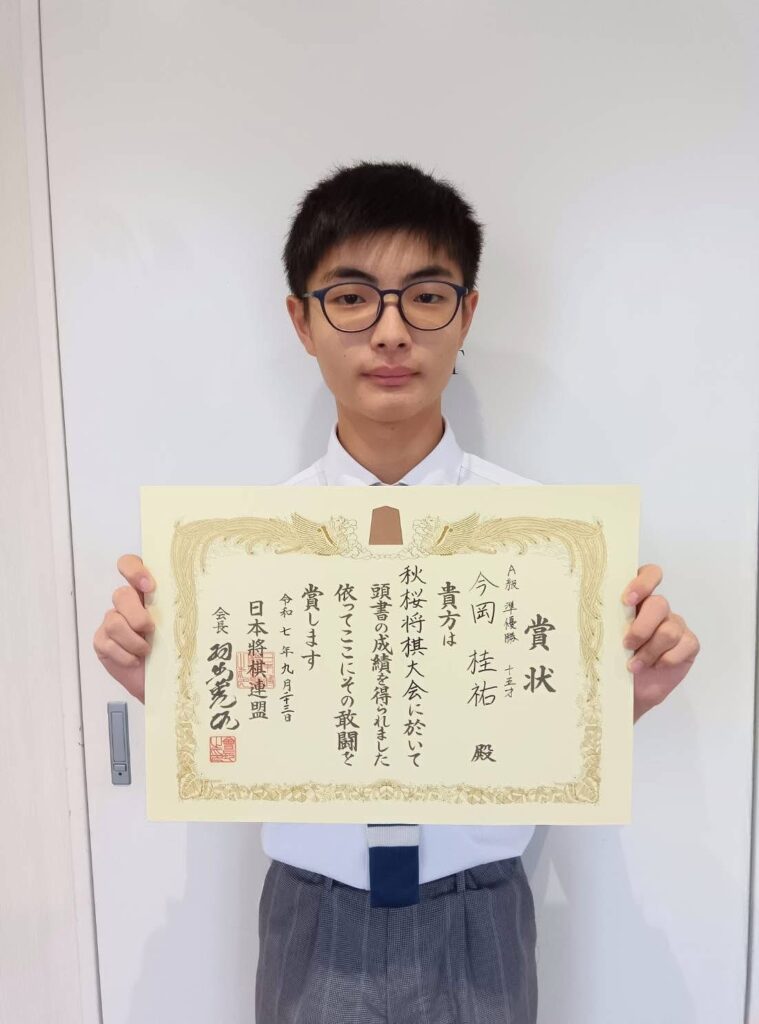 また、9月23日に吹田市立豊一市民センターにて行われた、秋桜将棋大会に本校の囲碁将棋部より、今岡 桂祐君(1年IT/寝屋川市立第十中学校)が参加し、A級(二段~2級)で準優勝することができました!