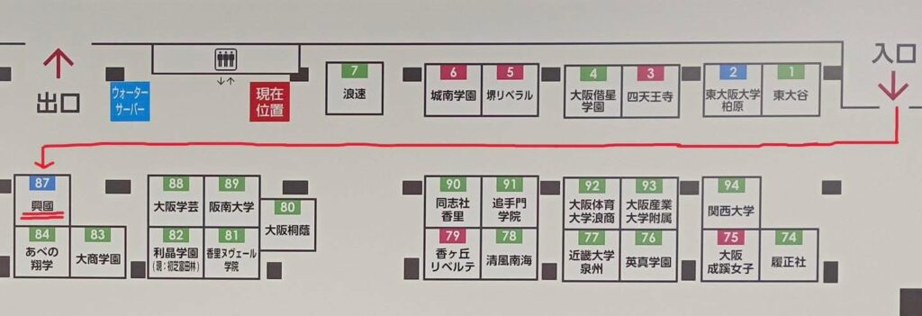 OMM2Fメインブースの入口からすぐに右方向へお進みいただきますと、「87番」が本校のブースでございます。