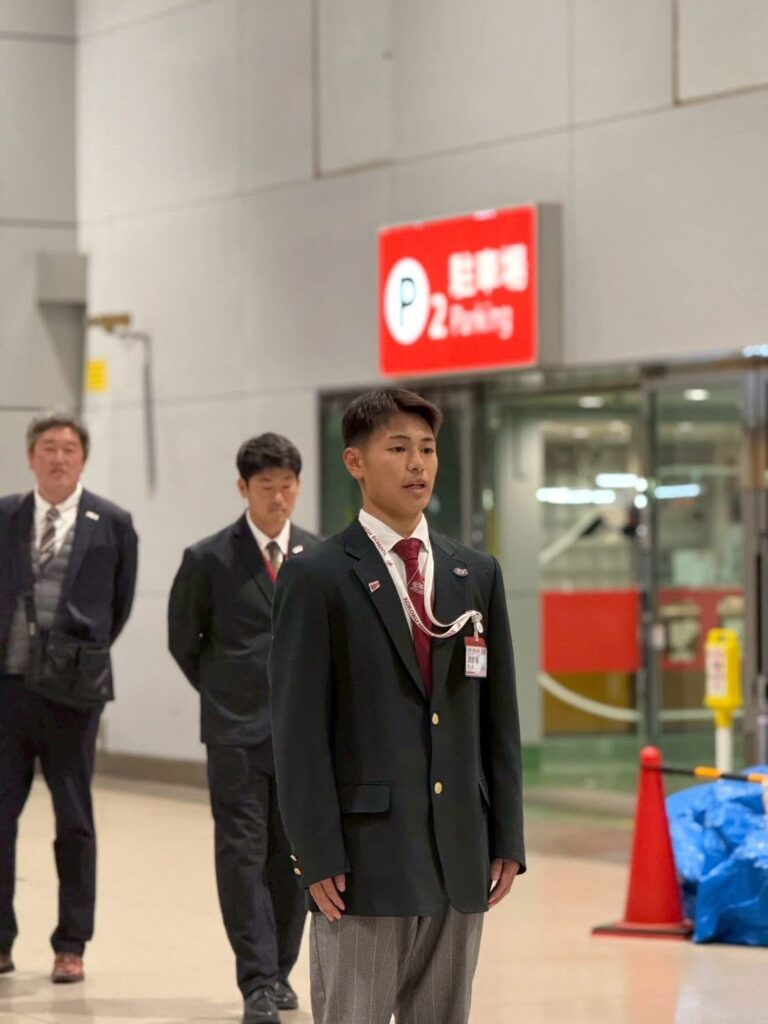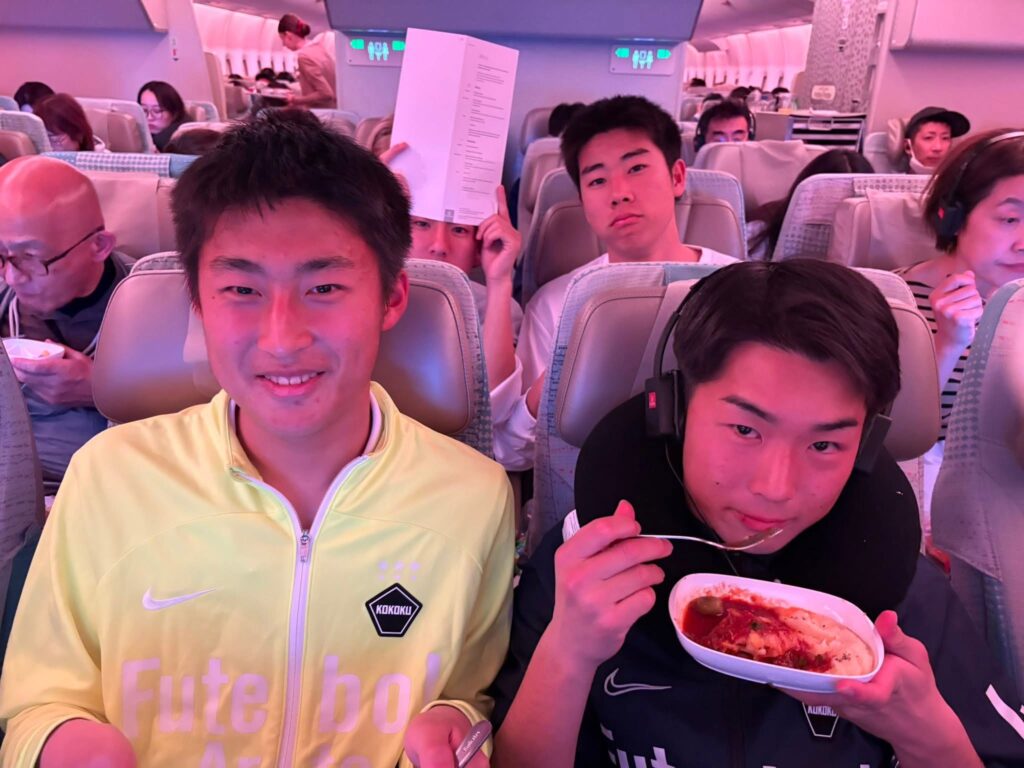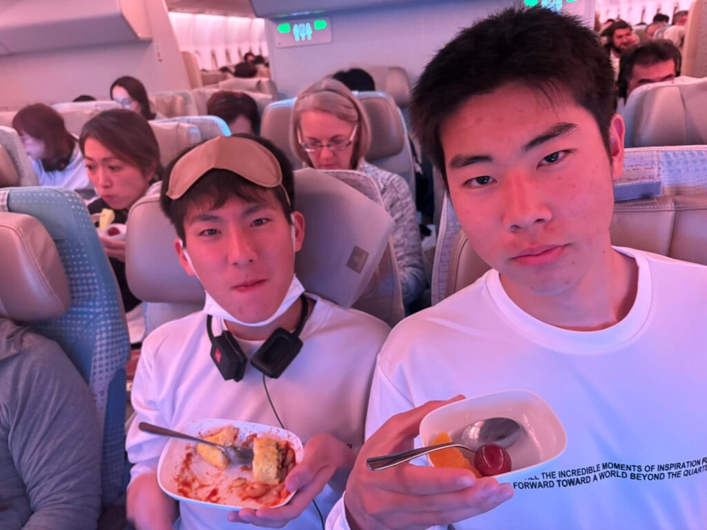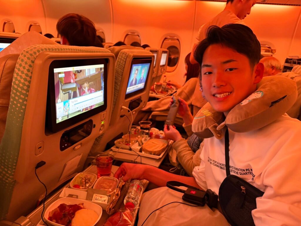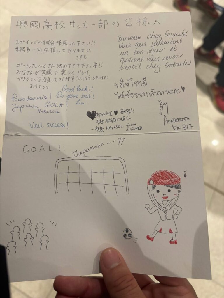 約11時間のフライトを経て、無事ドバイ空港に到着しました。機内食を食べるのが初めての選手が多く、緊張しながらも残す事なく美味しそうに食べていました!到着の際には、エミレーツ航空搭乗スタッフの皆様から、応援メッセージカードもプレゼントしていただきました!