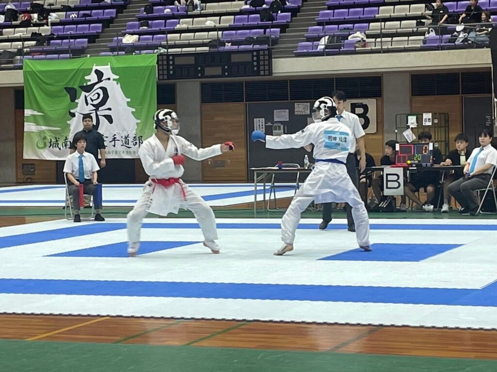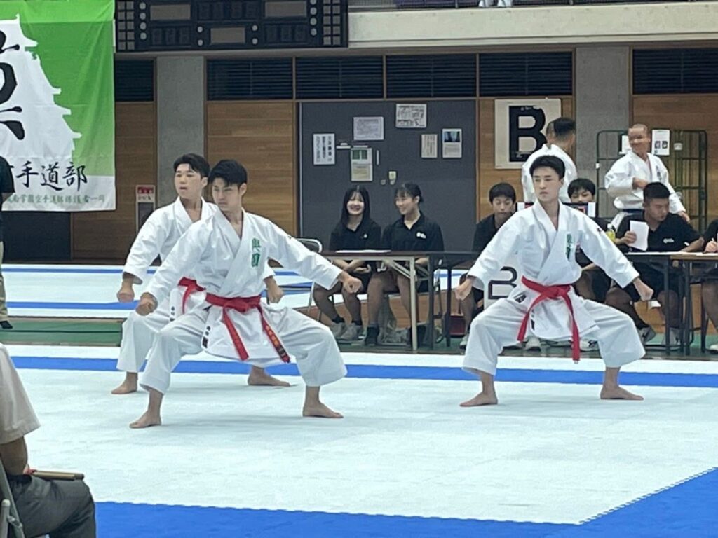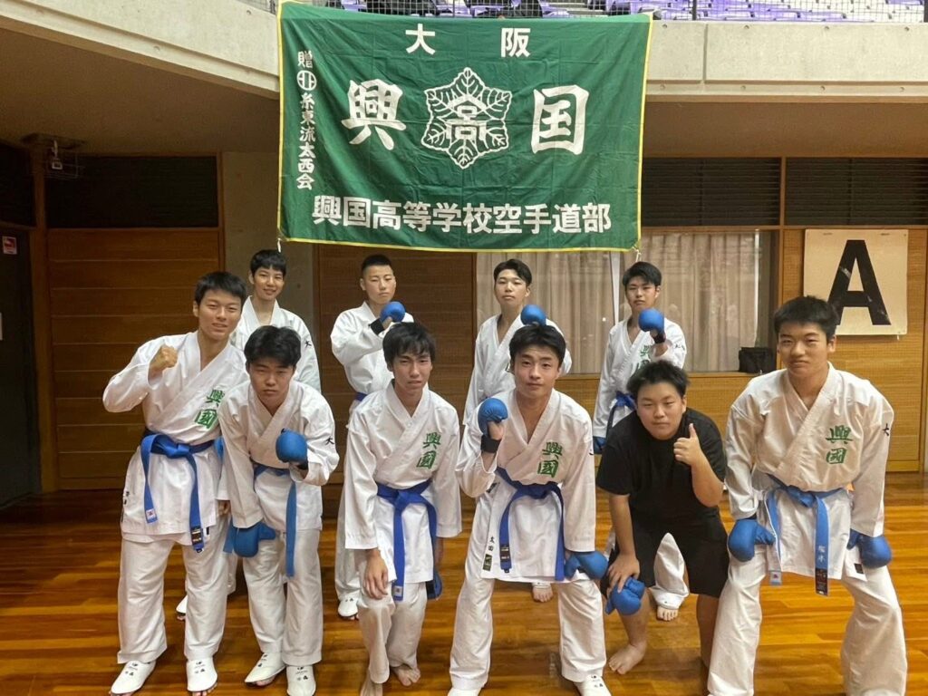 今大会は団体競技のみを行い、また試合の当日に抽選を行います。その結果、団体形では大阪学芸高等学校、団体組手では浪速高等学校との試合が決まりました。