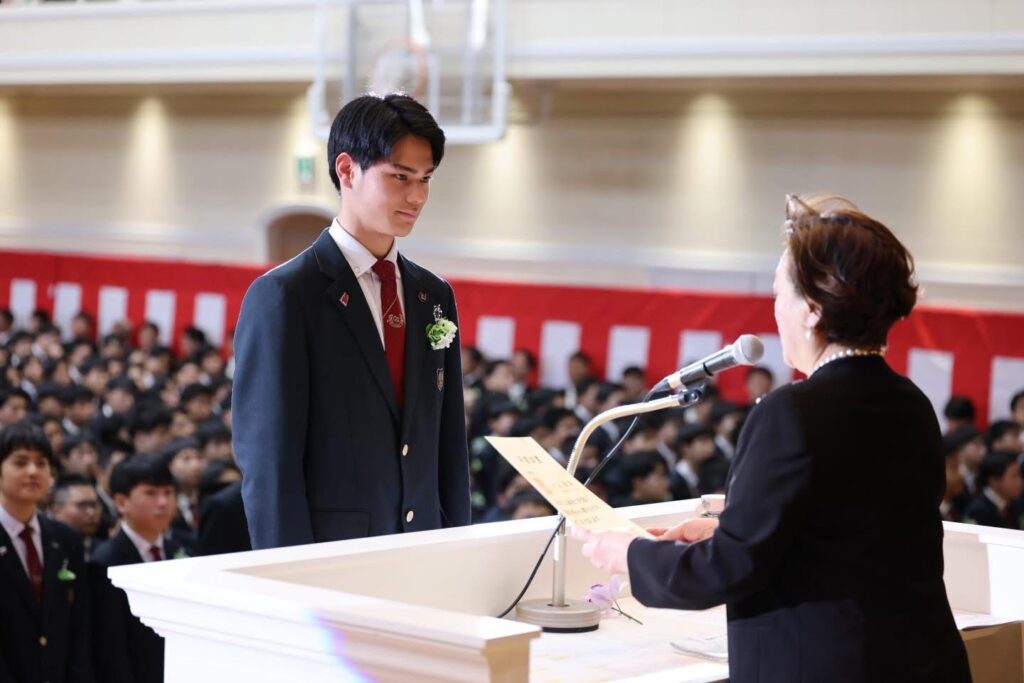 さらに式の終盤には、辻野 巧真(3年AAコース/ゴルフ部/PL学園中学校)と竹村 咲登(3年AAコース/サッカー部/鈴鹿市立神戸中学校)から、保護者の皆様へ感謝を伝えるサプライズメッセージが贈られました。これまで言葉にできなかった「ありがとう」がまっすぐに届けられ、涙をぬぐう姿も多く見られ、アリーナはこの日いちばんの温もりに満たされました。