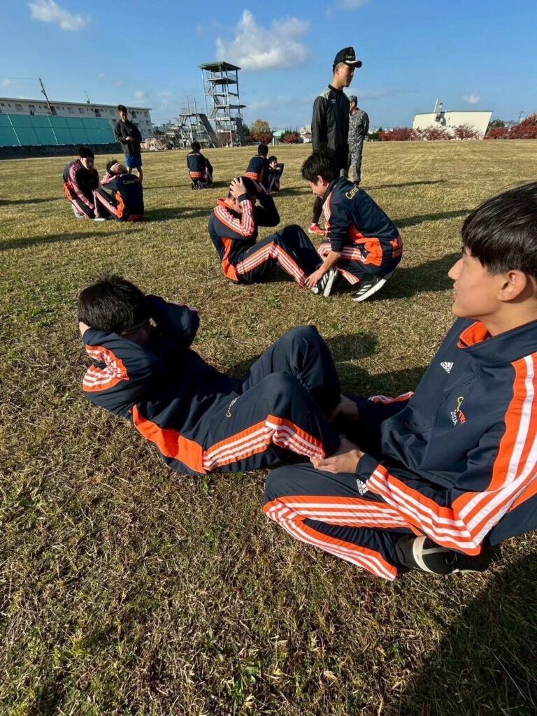 起床、点呼、朝食を終えたあとは、25分間のランニングからスタートしました。体が温まったところで、、2人1組になり、自衛隊体力検定に含まれる「腕立て伏せ」と「腹筋」をそれぞれ2分間実施しました。わずか2分間ですが、されど2分間。生徒たちは自分の体力の限界に挑戦し、大きな達成感を得ていました。