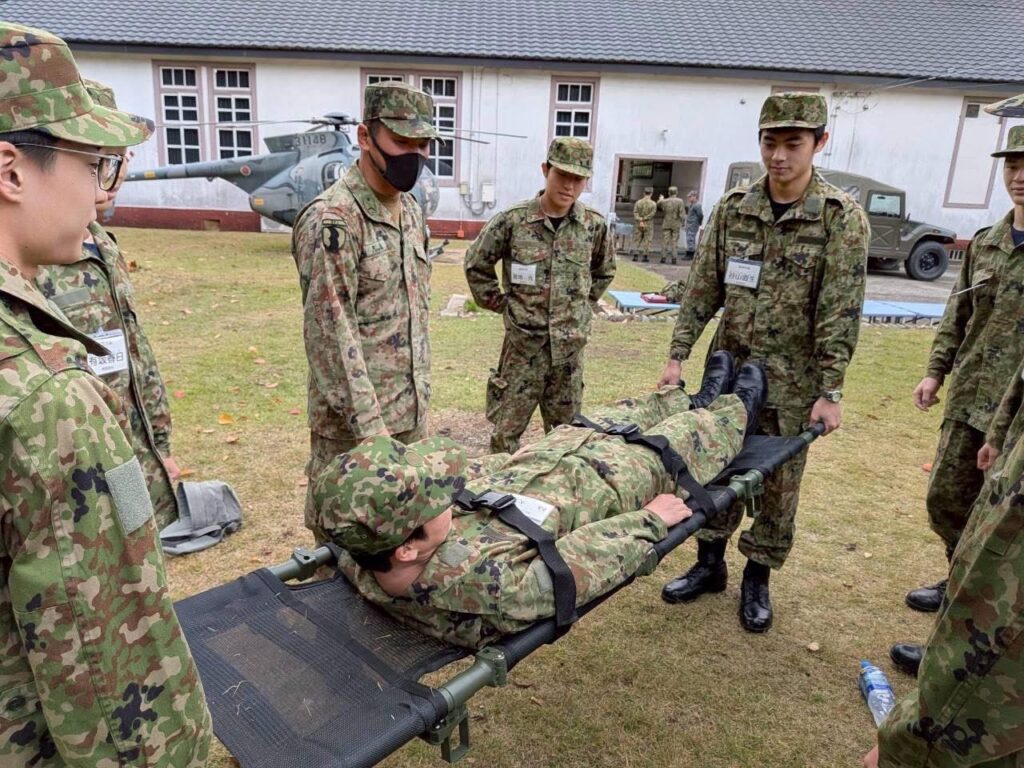 続いて、救急法や自衛隊の折りたたみ担架の扱い方を学び、人命救助の重要性について理解を深めました。